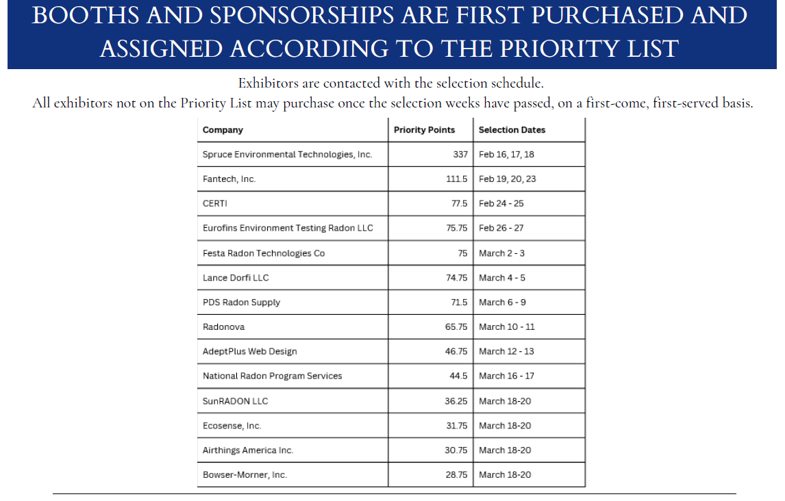 New exhibitors and sponsors should pre-register with Indoor Environments (AARST) to purchase booth(s) and sponsorships. All booth and sponsorship selections are purchased based on a priority point system. Priority exhibitors can purchase before others. (Details below)